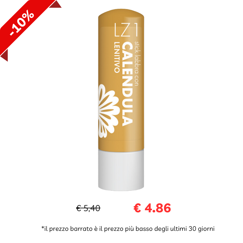 LENITIVO Con estratto di CALENDULA e burro di karité per labbra secche che tendono a screpolare. Benessere naturale per idratare e proteggere le labbra. Stick 4,5 g. PARAFFINUM LIQUIDUM, SYNTHETIC WAX, OCTYLDODECANOL, CERA MICROCRISTALLINA, BUTYROSPERMUM PARKII BUTTER, POLYGLYCERYL3 DIISOSTEARA TE, JOJOBA ESTERS, AROMA, HELIANTHUS ANNUUS SEED WAX, PENTAERYTHRITYL TE TRAISOSTEARATE, PROPYLENE GLYCOL, ACACIA DECURRENS FLOWER WAX, CALENDU LA OFFICINALIS FLOWER EXTRACT, POLYGLYCERIN3, PENTAERYTHRITYL TE TRADITBUTYL HYDROXYHYDROCINNAMATE. +/ (MAY CONTAIN) CI 77891. Applicare generosamente sulle labbra più volte al giorno, insistendo maggiormente sulle zone dove c'è maggiore necessità.